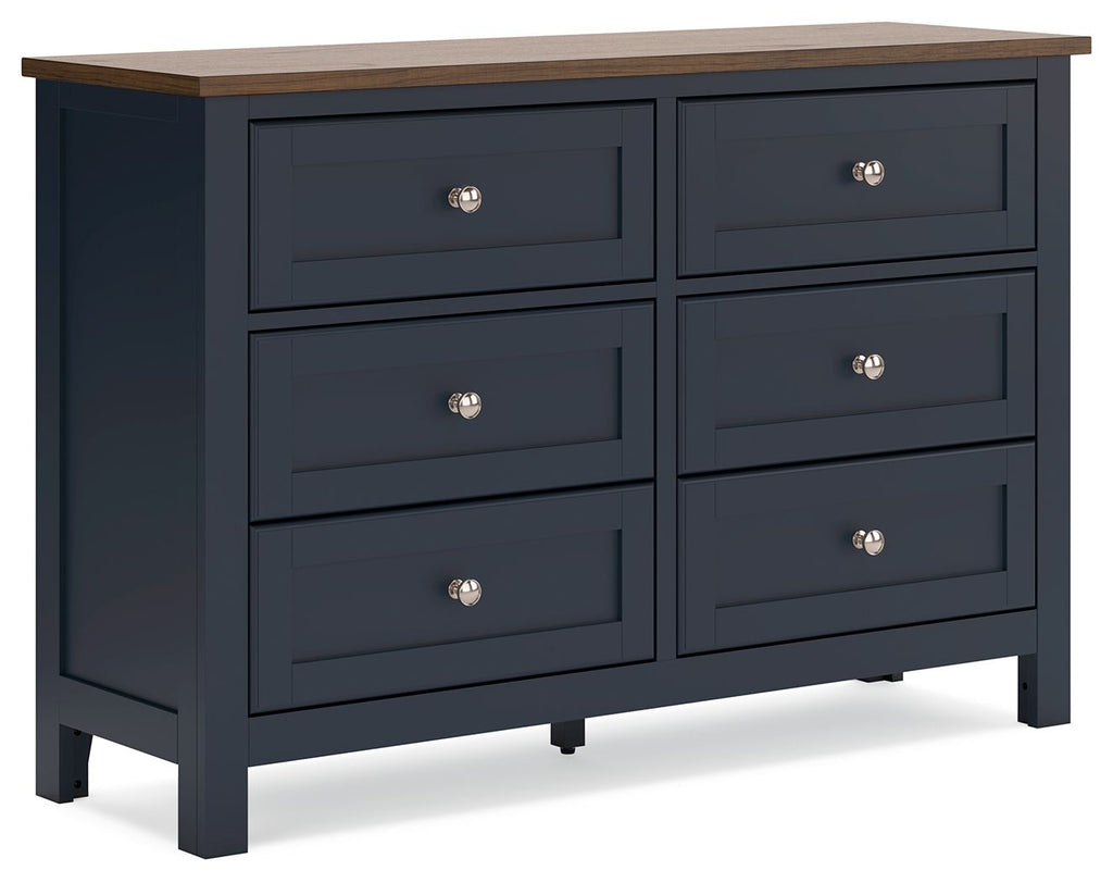 Add homespun charm to your restful retreat. A modern take on a timeless silhouette, this dresser pairs a dark slate blue finish with a light brown top. Drawer fronts and legs in a classic Shaker style bring an air of beautiful simplicity to the bedroom. Whether it's part of a charmingly curated guest suite or a casually carefree kids room, this dresser is a welcome addition.