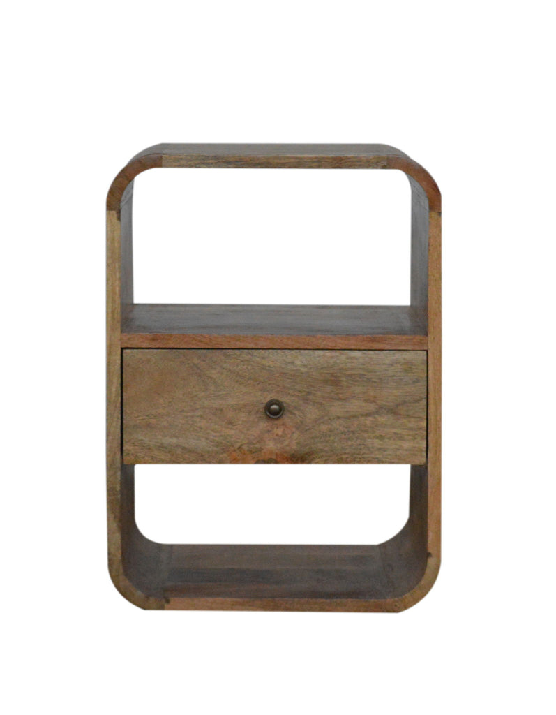 - London Nightsand - This solid wood nightsand has been constructed from 100% solid mango wood in an oak-ish finish and offers a nice rounded look on the edges. It features 1 drawer which comes with a shiny knob and 2 open slots for extra storage. A great, simple addition to the bedroom.