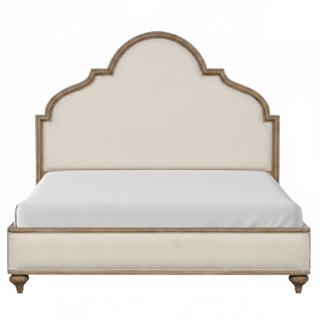Transitional Style: Blends traditional design with modern functionality Rustic Oak Finish: Warm, natural tone enhances room aesthetics Solid Wood Frame: Durable construction with accents Upholstered Headboard and Footboard: Soft fabric adds comfort and elegance Unique Leg Design: Distinctive legs elevate the bed's visual appeal USB Ports Included: Convenient charging access...