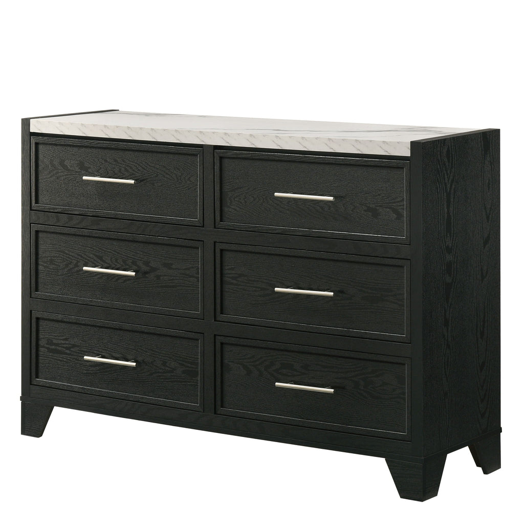 Modern Style: Sleek, contemporary design with clean lines for a sophisticated look Six Drawers: Ample storage capacity for organized living Faux Marble Top: Elegant white surface with realistic marble pattern Black Finish: Rich wood grain appearance for dramatic visual contrast Engineered Wood Construction: Durable and long-lasting material quality Metal Bar...