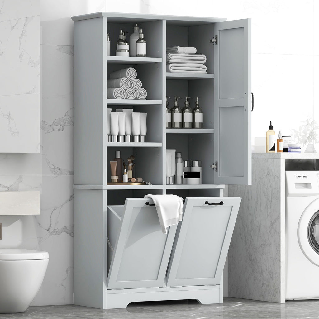 Bathroom Storage Cabinet With Doors And Drawers, Tilt Out Laundry Hamper, Multiple Storage Space, Freestanding Style, Open Shelve, Adjustable Shelf - Gray