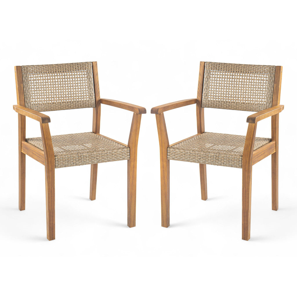 Timeless Design: Adds elegance to any outdoor space. Weather-Resistant: Built to withstand harsh weather conditions. Premium Material: Made from high-quality Acacia wood. Added Comfort: Features weather-resistant wicker accents. Unique Appearance: Natural wood grain ensures no two chairs are alike. Convenient Dimensions: Each chair measures 22.50" W x 22.50" D x...