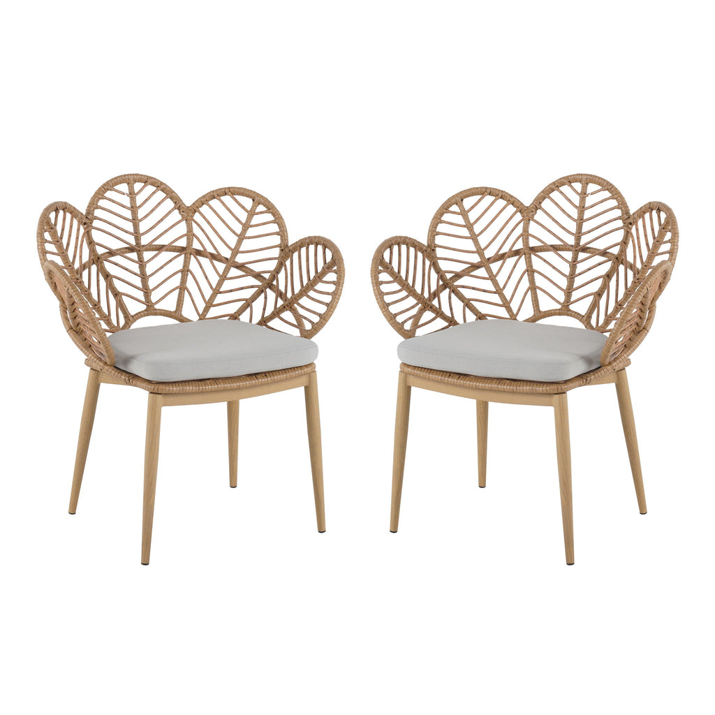 Natural Elegance, Modern Engineering: A harmonious blend of synthetic rattan and iron frame offers natural charm and durability. Floral Ergonomics: Petal-shaped backrest provides supportive comfort and adds whimsical sculpture to outdoor spaces. Sun-kissed Comfort: Plush beige cushions are water-repellent and stain-resistant for easy maintenance. Grounding Teak Details: Teak finished legs...
