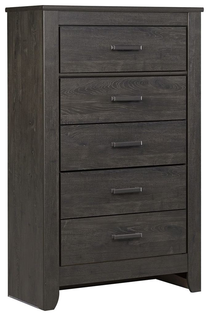 Priced to entice and styled to impress, this alluring chest of drawers is urban sophistication with a decidedly relaxed air. It’s got the crisp, clean lines of a contemporary piece, but with an earthy element. Replicated oak grain effect gives the chic charcoal finish warmth and character. Linear pulls are a sleek touch.