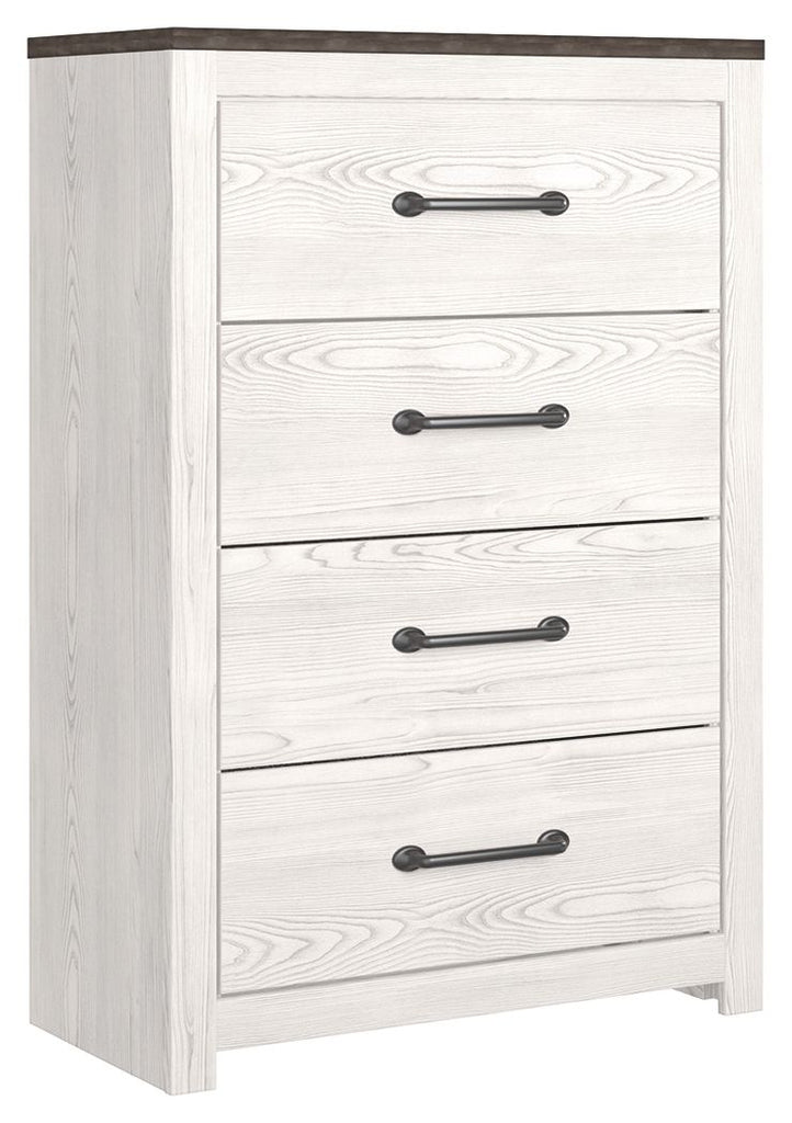 Cool, clean and casually modern. This chest’s wispy whitewash and gray finish sets the tone for your calming sanctuary. Large linear pulls add dimension and authenticity. Four smooth-gliding drawers neatly accommodate your wardrobe needs.