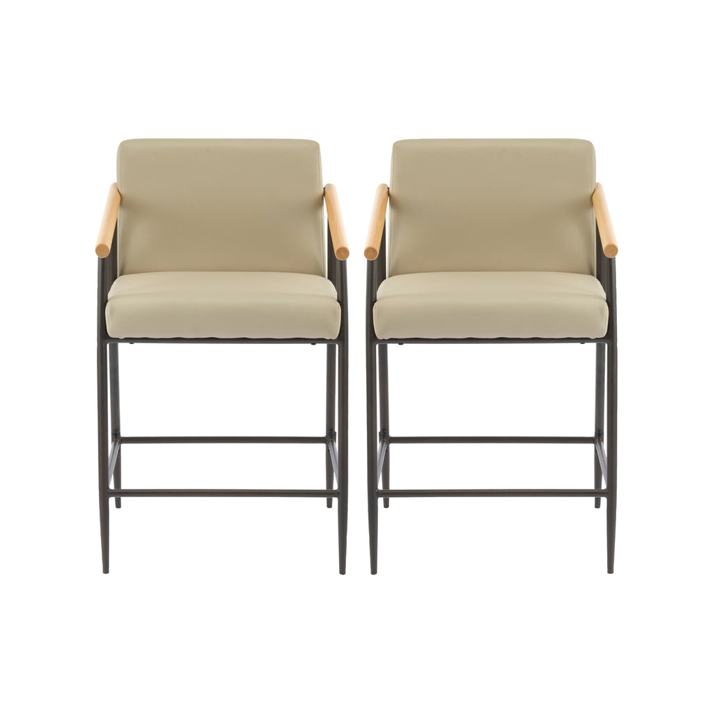 Includes: Two (2) Counter Stools; set of 2 Counter Stools Design: Mid-Century Modern style with sleek metal frame and minimalist aesthetic Natural Charm: Solid rubber wood armrests add warmth and elegance. Comfort: Thick, soft cushions for a sink-in seating experience Durability: Sturdy espresso metal frame supports up to 300 lbs...