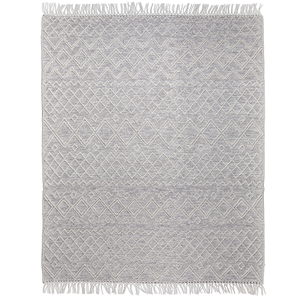 DIMENSIONS: 8 ft x 10 ft 96"d x 120"w x 0.5" h Durable Blend of 41% Wool 25% Cotton 23% Polyester 6% Acrylic 5% Rayon Rug Thickness: 0.5" Durable hand woven construction with Hand Knotted Fringe Detailed with a diamond pattern in Ivory and Brown featuring a hand-knotted fringe No...