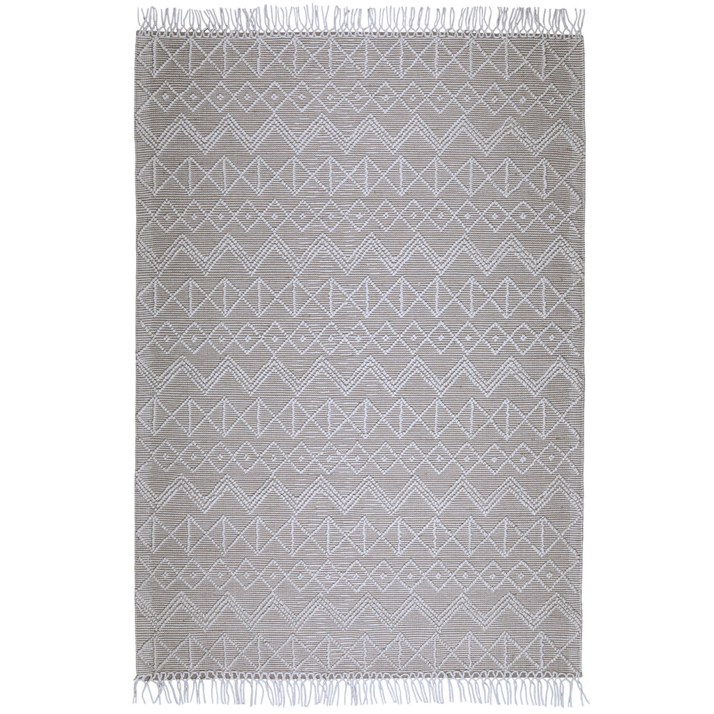 - Detailed with a geometric pattern in ivory and taupe featuring a hand-knotted fringe