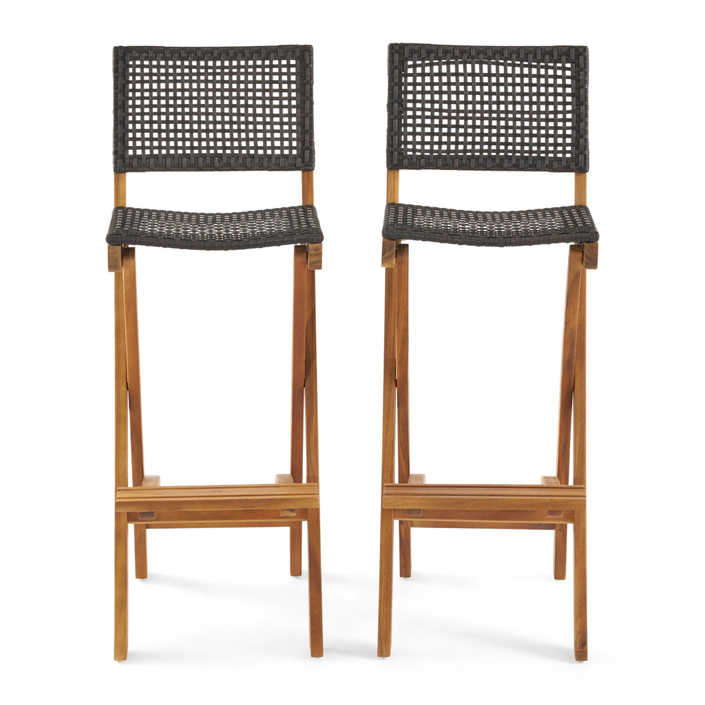 Outdoor Folding Acacia Wood Barstools With Rattan Backrest And Seat (Set of 2) - Teak