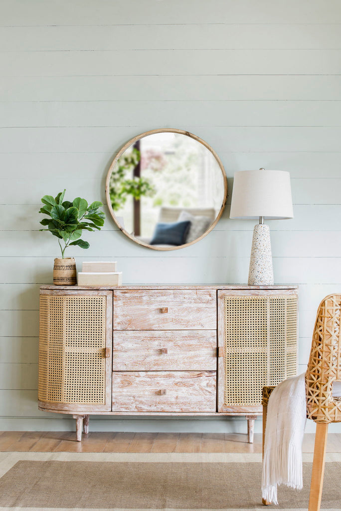 Breezy Design: Cane doors enhance the casual vibe of this TV console, making it ideal for relaxed spaces. Ample Storage: Features three drawers and two doors, providing extra storage for electronics and other items. Mixed Materials: Made from 50% Acacia wood, 45% cane, and 5% MDF with a sandblast finish....