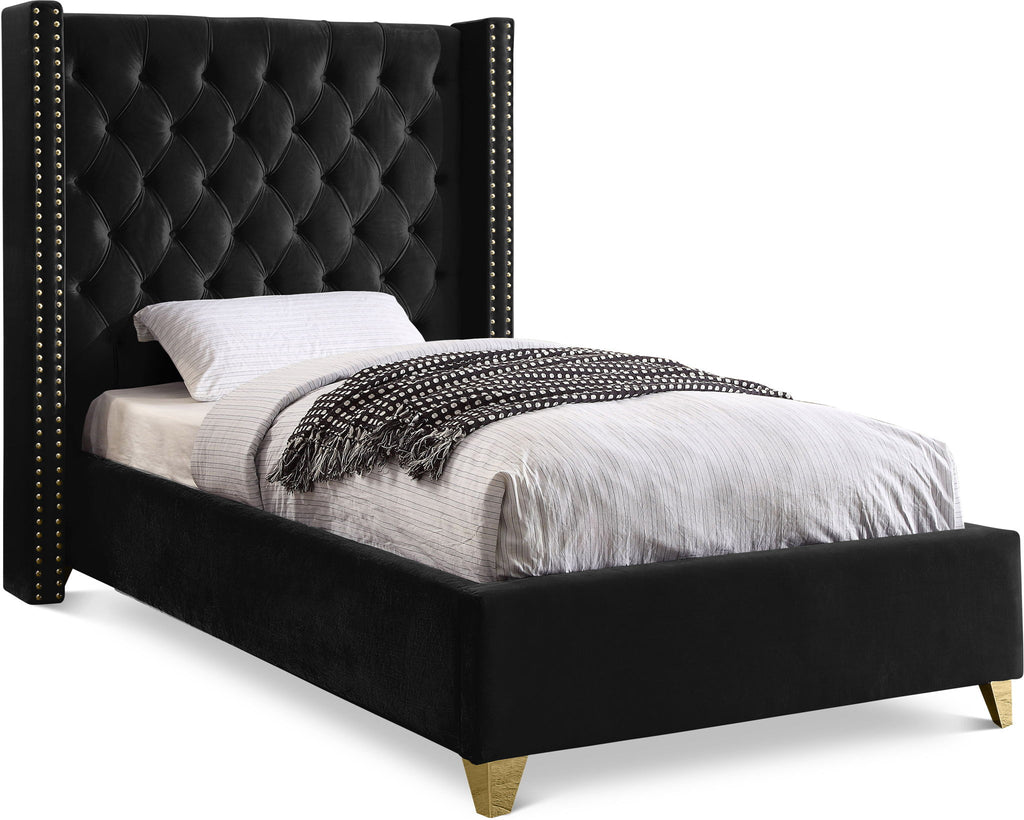 Elegant and eye-catching, the stunning Barolo Bed from Meridian Furniture is the perfect addition to any bedroom. velvet covers the deep tufted design. Strength and beauty is guaranteed with a solid wood frame and stainless steel legs.