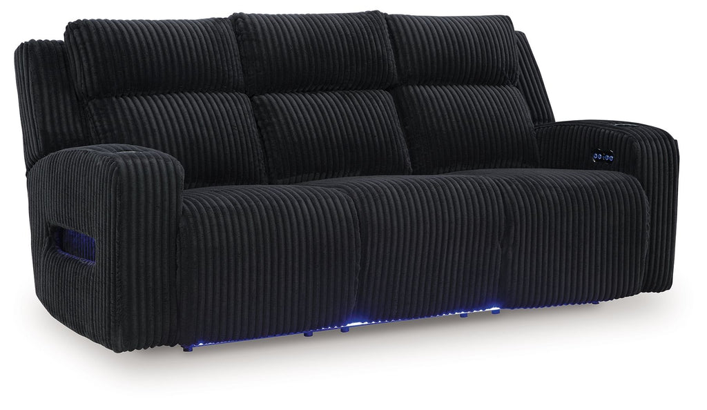 Trend-right style, meet irresistible modern function. Your living room gets a cozy-cool upgrade with this power reclining sofa. Curl up in its ultra-chic corded upholstery and recline with one-touch controls. Is it movie night or game time? With ambient LED lighting and wireless audio connectivity, this sofa transforms from a serene relaxation spot to an entertainment hub. Its drop-down table, USB charging and cup holders make lounging all the more convenient.