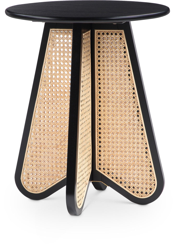 Bring impressive style and impeccable beauty to your living room or family room with this Butterfly end table. This handsome table is part work of art, part functional addition to your room. An expansive round oak veneer top gives you room for resting a drink or book or lamp to brighten the night. Construction with rubberwood and wood products gives this Butterfly table a resilient design, while its natural cane bottom adds a striking visual and instantly draws the eye.