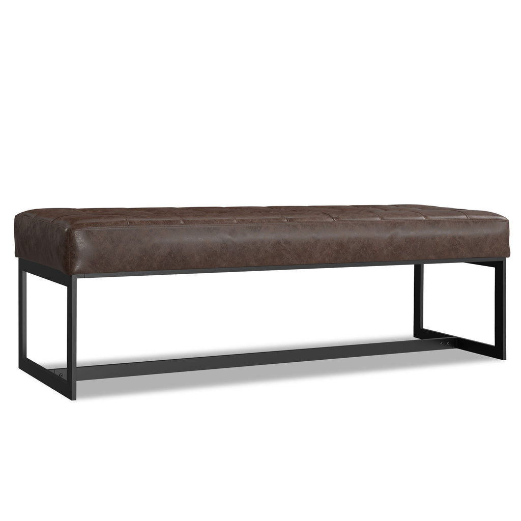 Dimensions: 18" D x 56" W x 18" H Upholstered in durable Brown genuine leather High density foam seat cushion for comfort Black metal base and legs for durability Top tufting detail enhances visual appeal Multi-functional design suitable for multiple spaces Modern contemporary style complements various decor Penelope - Ottoman...