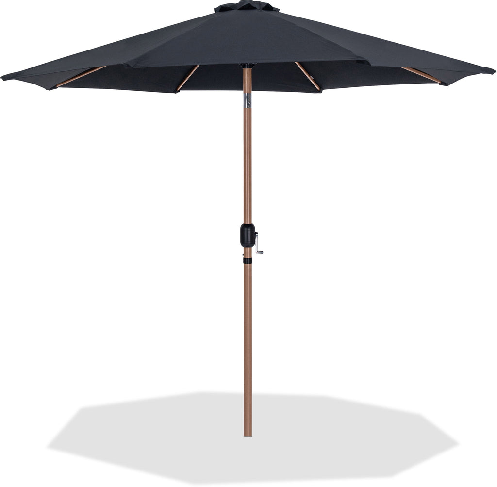Bask in the shade wherever it's needed when you bring home this Fiji fabric and teak aluminum patio umbrella. This ingenious umbrella can be used as a standalone umbrella on a deck or patio - or add it to your choice of table for a sturdy solution for hiding from the sun's rays. The aluminum pole weathers the elements like a champ, and the umbrella is crafted from water-resistant fabric for a beautiful, lasting look.